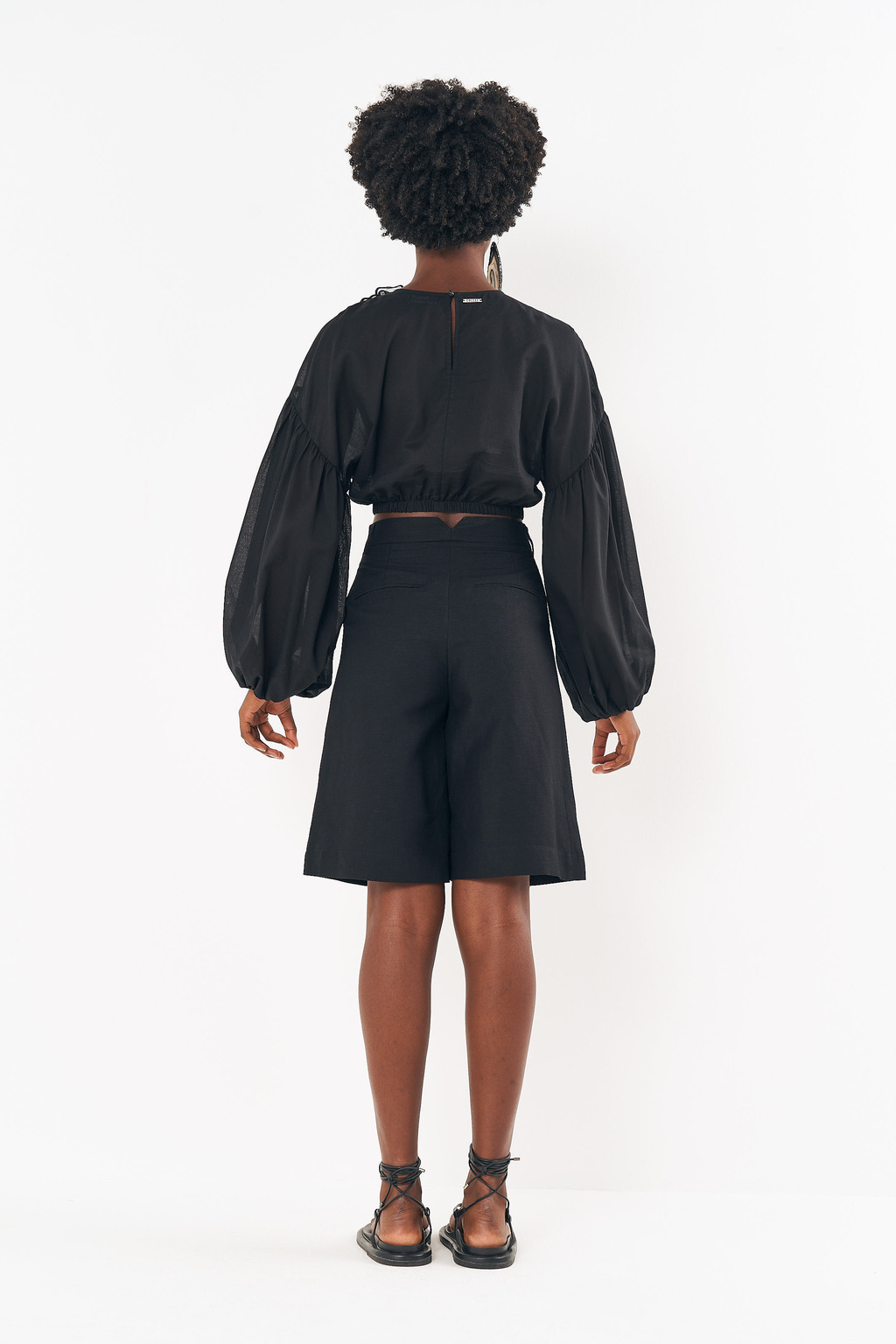 • Para um conjunto monocromático sofisticado, como visto na imagem, combine com o cropped peplum de mangas bufantes da mesma coleção e finalize com sandálias de tiras.