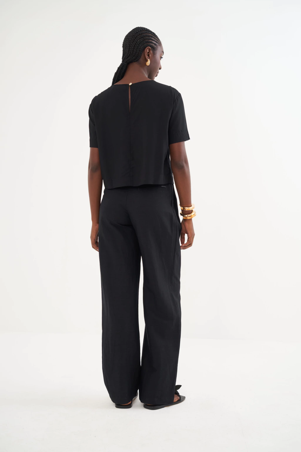 Design: Modelagem reta e soltinha com mangas curtas e decote redondo, valorizado por um delicado drapeado frontal que adiciona movimento e charme à peça.