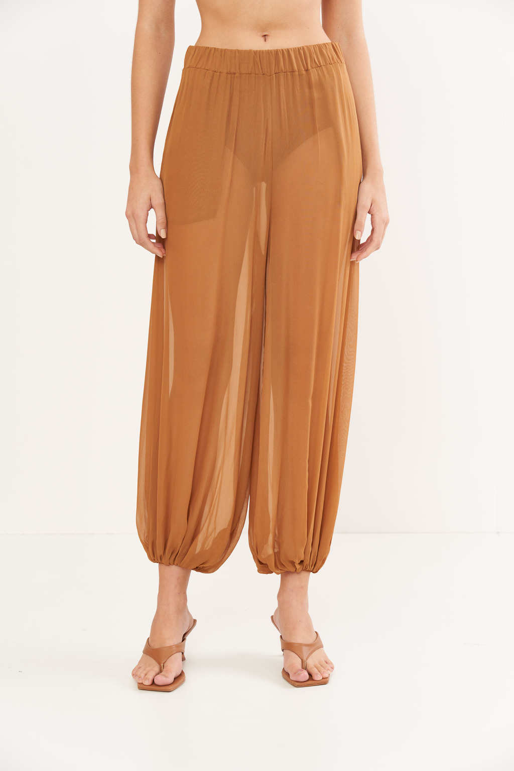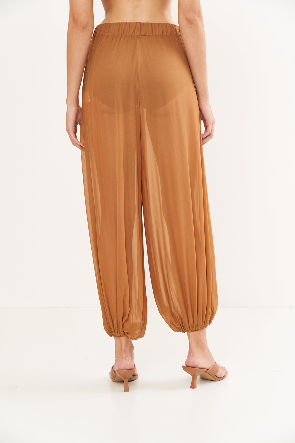 Design: Modelagem ampla e fluida, com cintura alta marcada por elástico confortável e pernas volumosas que se afunilam suavemente com elástico nos tornozelos, criando um efeito harém pants moderno e sofisticado. A transparência elegante do tule é o ponto alto, conferindo um ar romântico e ousado.