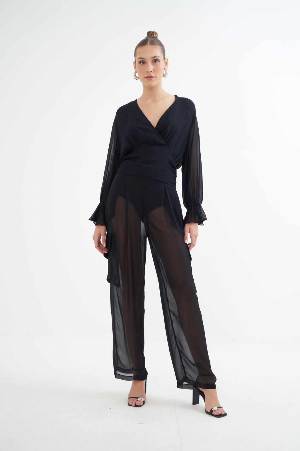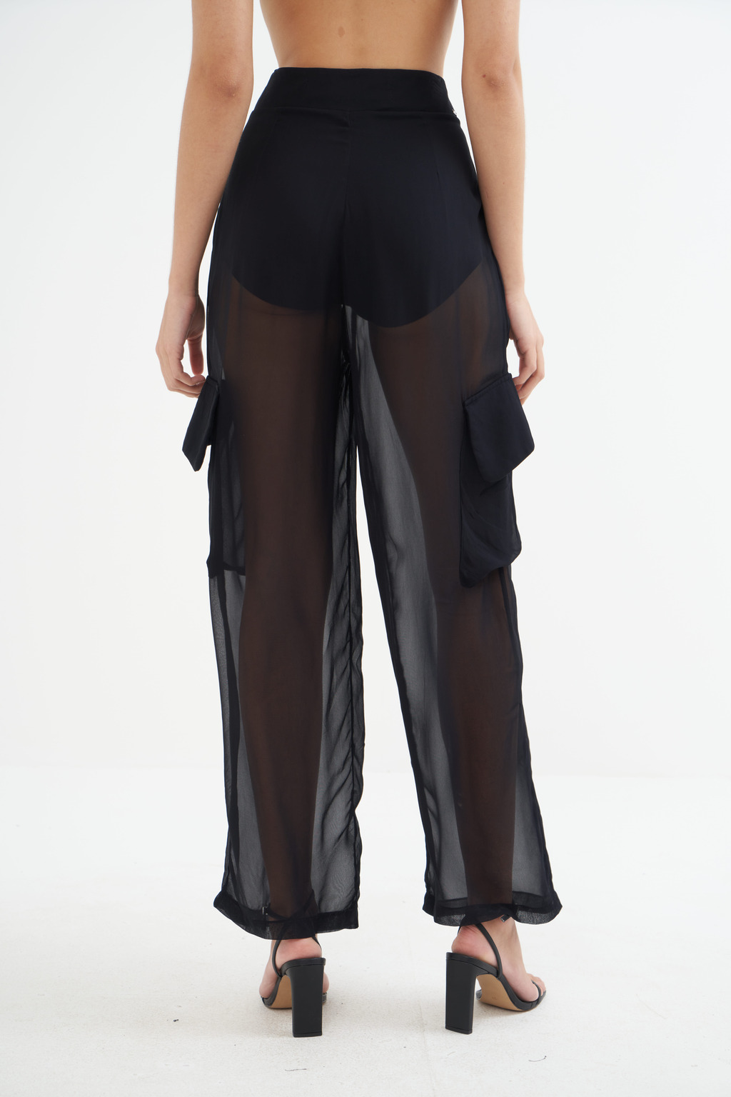 Design: Modelagem cargo com pernas retas e amplas. A cintura é alta e estruturada, criando um contraste com a fluidez do tecido transparente.