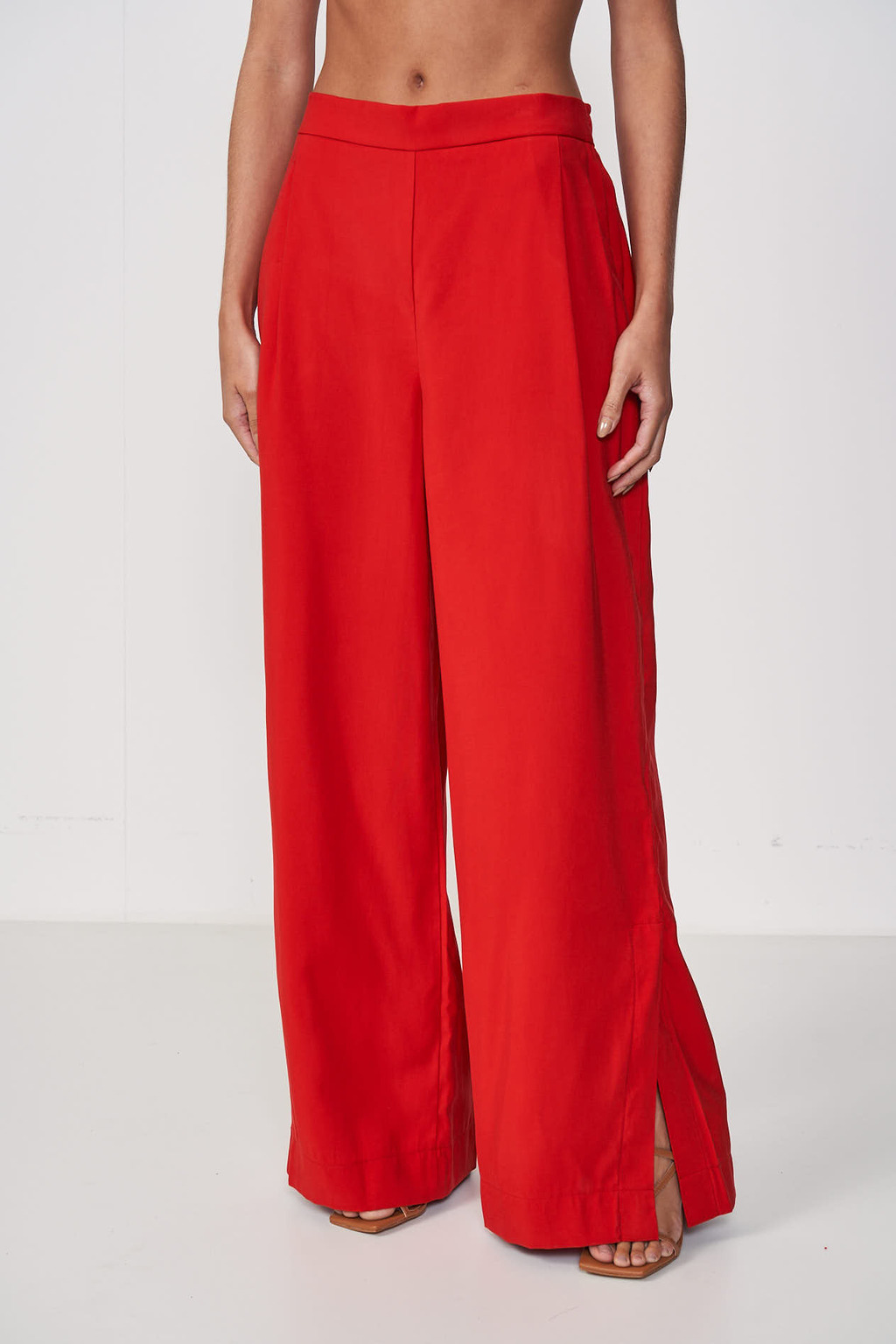 - Design: Modelagem pantalona, cintura alta, fendas laterais