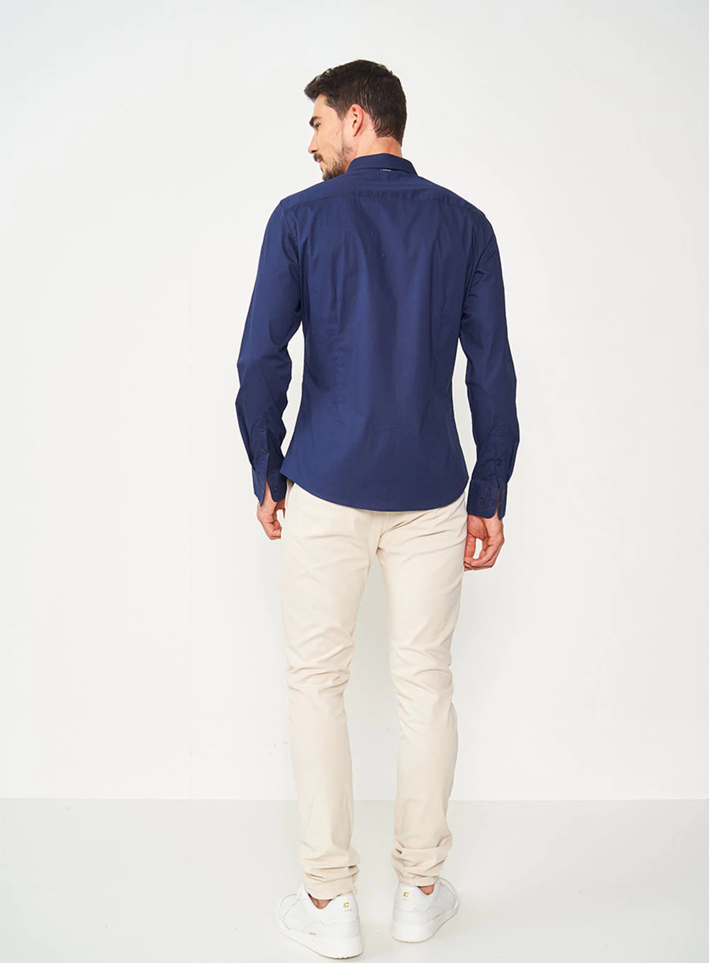 Camisa apresenta shape reto e modelagem fit. Possui gola colarinho, abertura com botões, mangas longas com punho e barra com acabamento arredondado.
