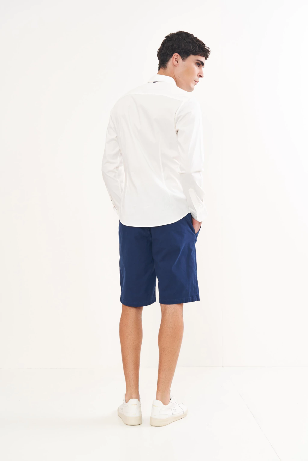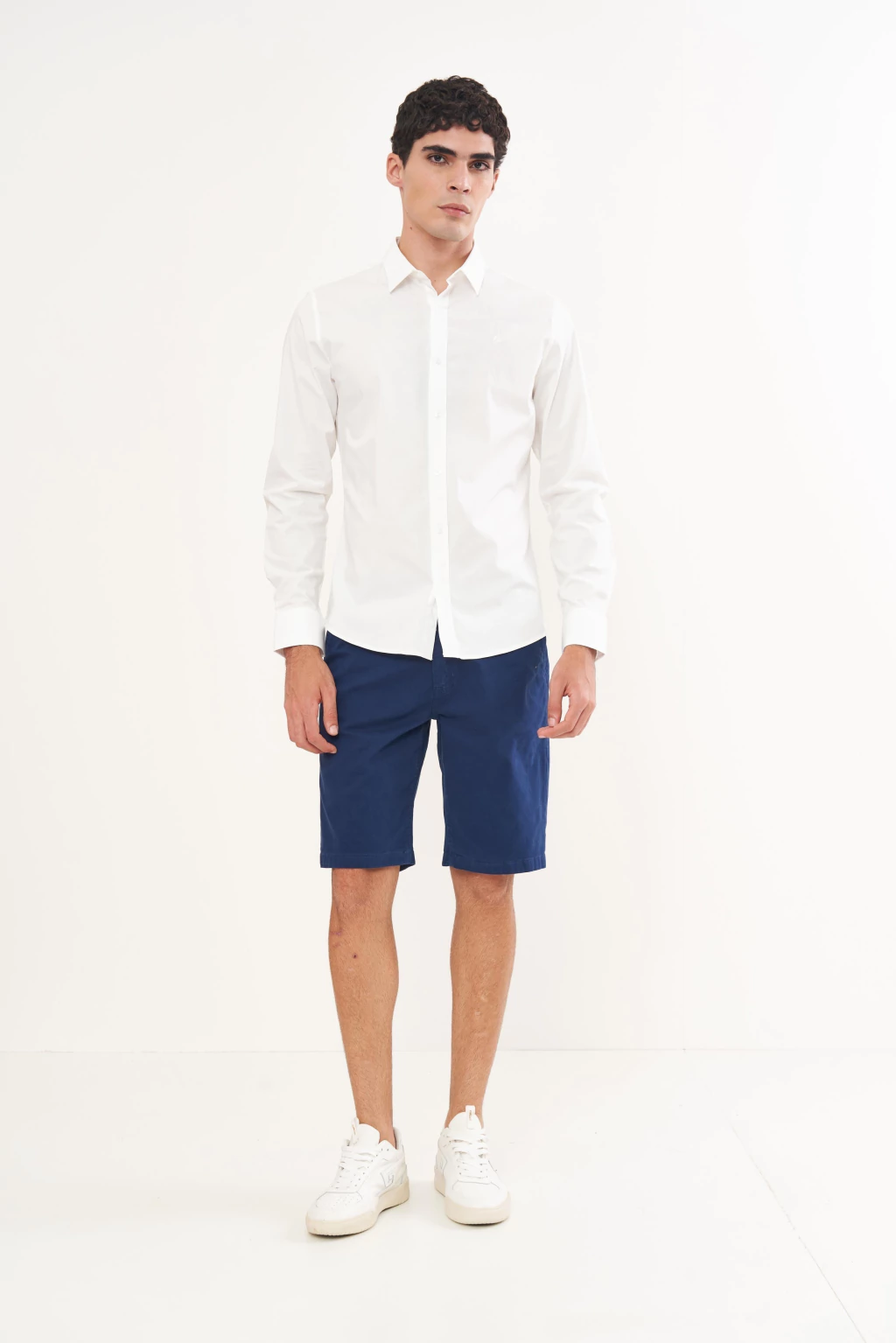Apesar de mais despojadas, as bermudas ficam ótimas com camisa polo. As que possuem tecidos jeans ou sarja, com modelagem mais reta e comprimento acima do joelho, fazem uma combinação perfeita.