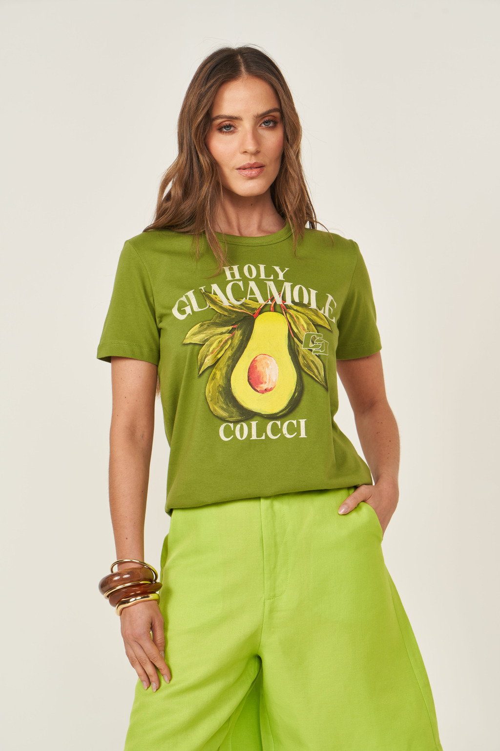 Camiseta: Modelo com manga curta e caimento tradicional, ideal para compor visuais leves e divertidos. Apresentada na cor verde, possui estampa frontal com ilustração de abacate e a frase “HOLY GUACAMOLE COLCCI”, trazendo irreverência e personalidade à peça. A gola careca complementa o design casual e moderno.