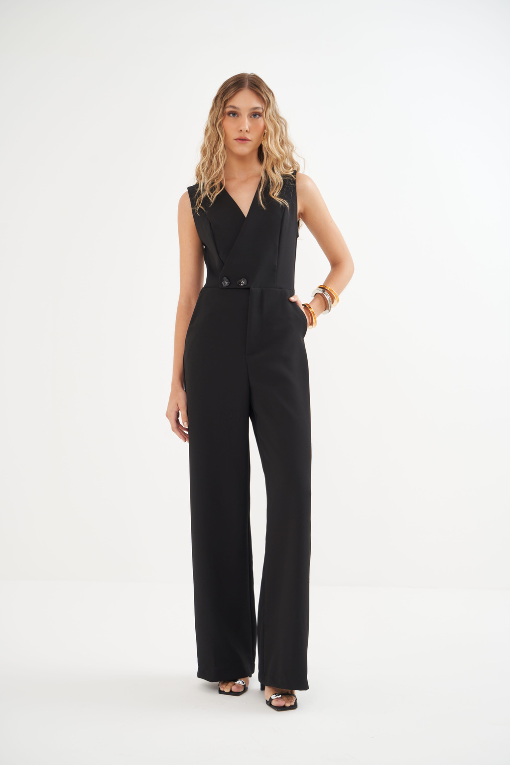 Design: Modelagem longa sem mangas, com pernas amplas (pantalona) que garantem fluidez. O corpo possui um design transpassado com lapela, inspirado em um blazer, criando um decote V sofisticado. A cintura é marcada e bem definida.
