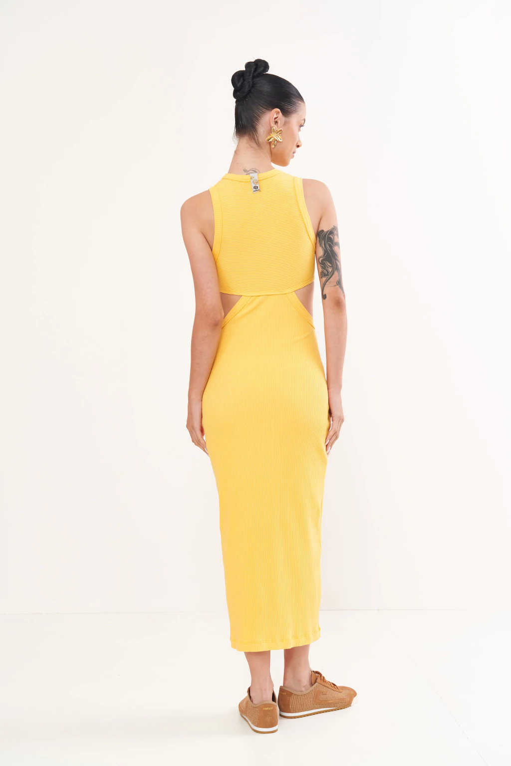 A cor do sol em uma silhueta que celebra o corpo. Este vestido é a tradução perfeita da energia radiante da coleção RIVIERA. Os recortes estratégicos na cintura adicionam um toque de sensualidade e modernidade, enquanto a malha canelada de algodão garante conforto absoluto para viver os dias de primavera com estilo e autenticidade. É a peça que transita com elegância do casual ao sofisticado, capturando todos os olhares.