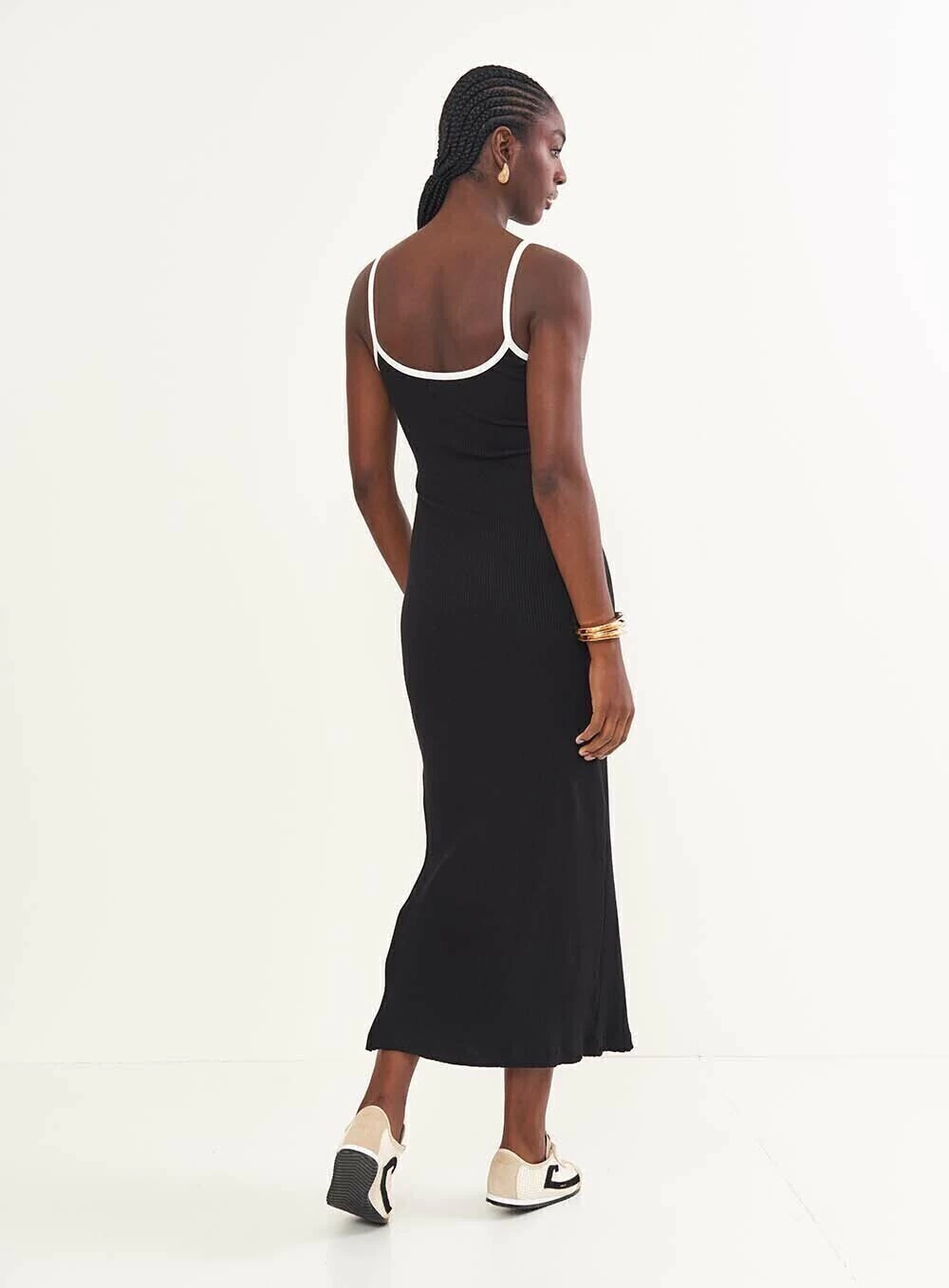 Design: A modelagem slim com o tecido canelado valoriza a silhueta, enquanto a fenda lateral adiciona um toque de sensualidade e movimento. O contraste do branco no decote e nas alças traz um charme extra.
