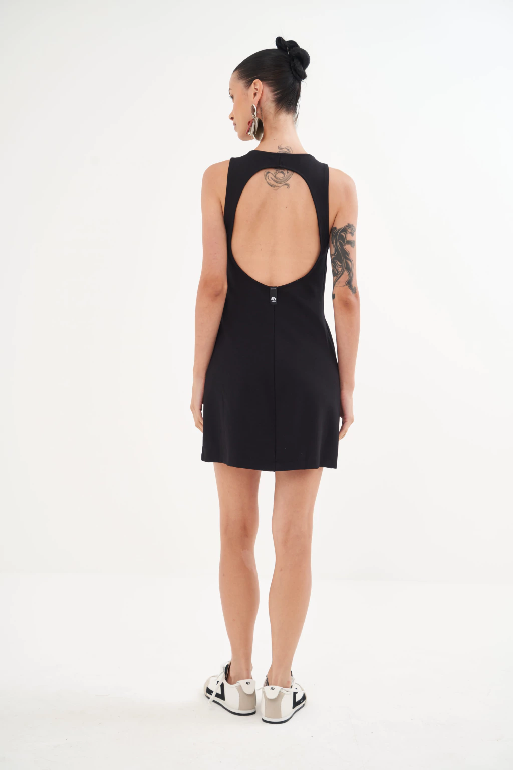 Para um visual despojado e cool, perfeito para um passeio ensolarado, combine com tênis de sola robusta e maxi brincos, como na foto. Transforme o look para a noite com sandálias de salto fino e uma clutch elegante; o cabelo preso em um coque alto destaca o magnífico decote nas costas. Para os dias mais frescos, um blazer oversized cria uma sobreposição estilosa e moderna.