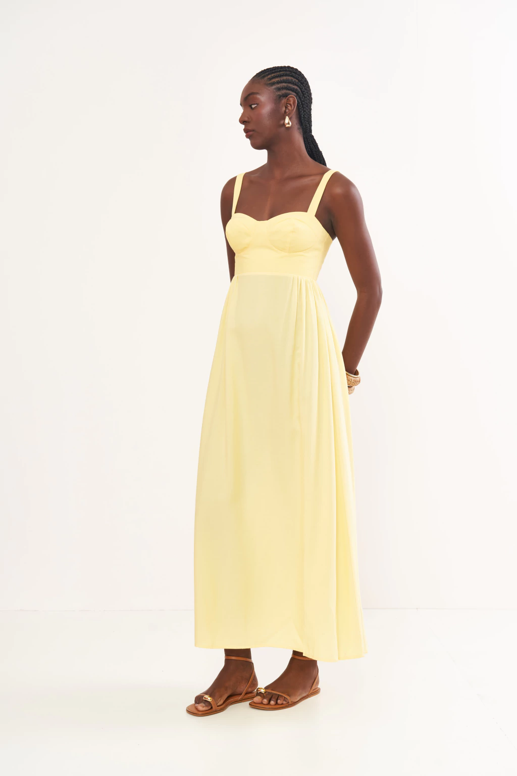 Inspirado na doçura do sol da primavera, este vestido é a definição de romantismo e feminilidade. A silhueta, que une um busto estruturado a uma saia fluida, cria um contraste harmonioso que celebra a forma com elegância e leveza. Em um delicado tom de amarelo pastel, esta peça da coleção Riviera é um convite para viver os dias ensolarados com sofisticação, frescor e uma dose de sonho.
