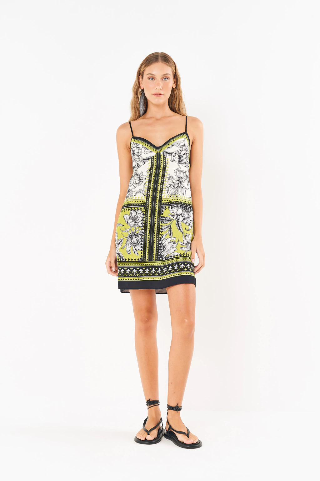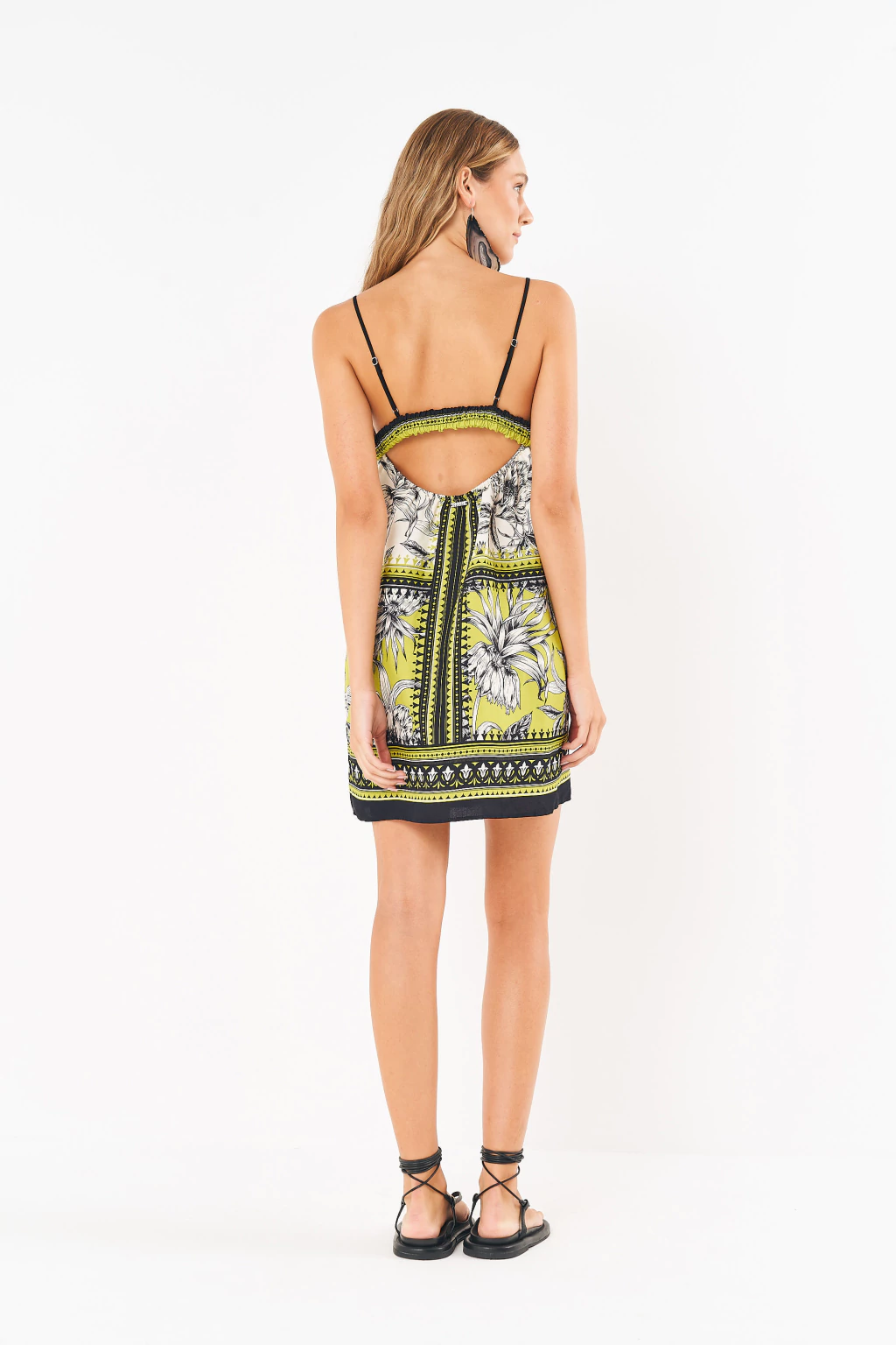 • Para um look statement, combine o vestido com sandálias de amarrar no tornozelo e maxi brincos, como na foto, para realçar o estilo boho-chic da peça.